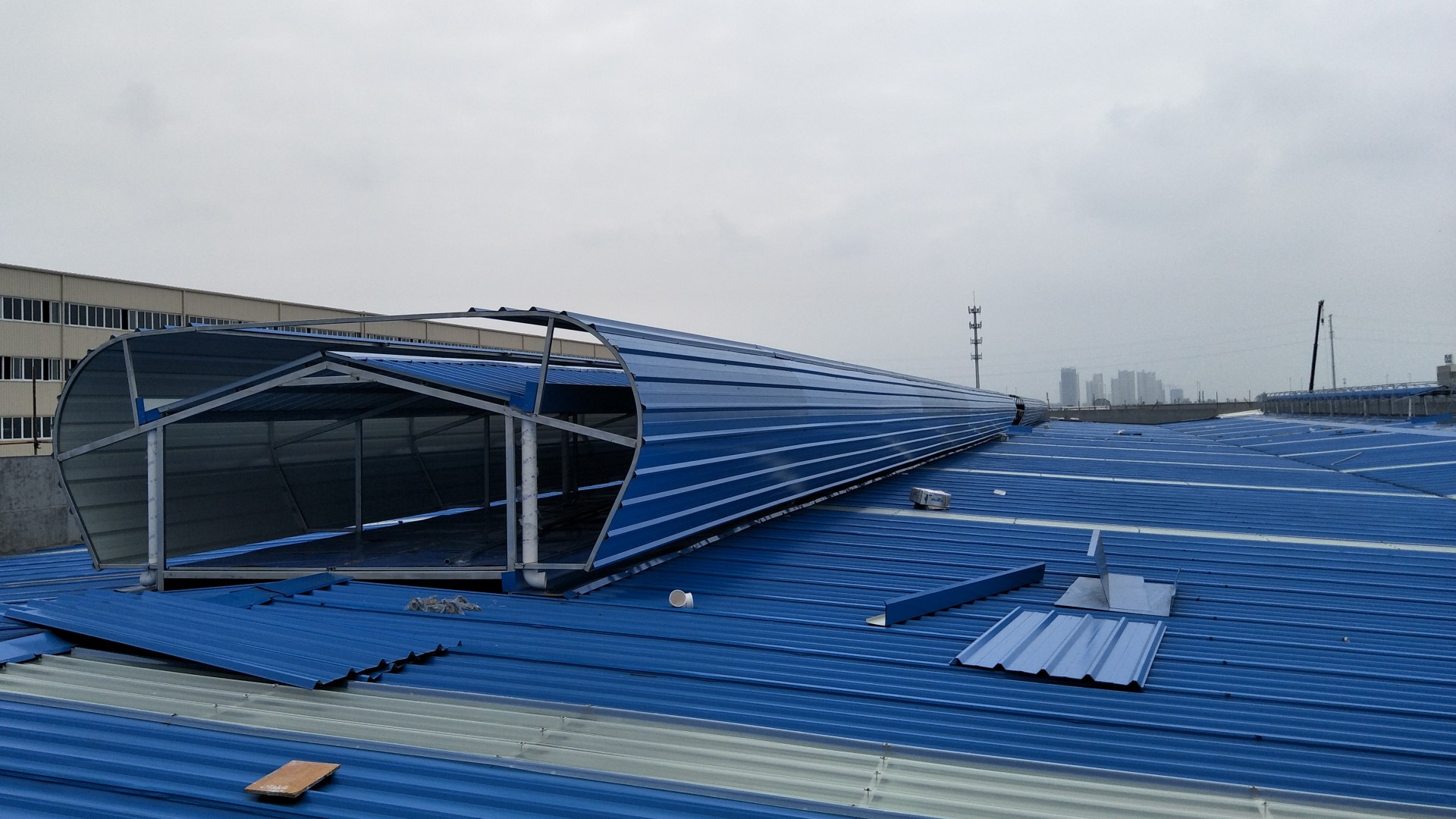 屋顶通风器的护板即外围板,一般是采用彩色压型刚作为材料(即彩钢板)。外护板是整个流线型通风器首先给人的印象,也是自然通风器直观的外表,常年会受到自然天气的侵害,所以需要具备防腐蚀、防锈蚀的功能,以期能够面对严酷的恶劣自然条件。