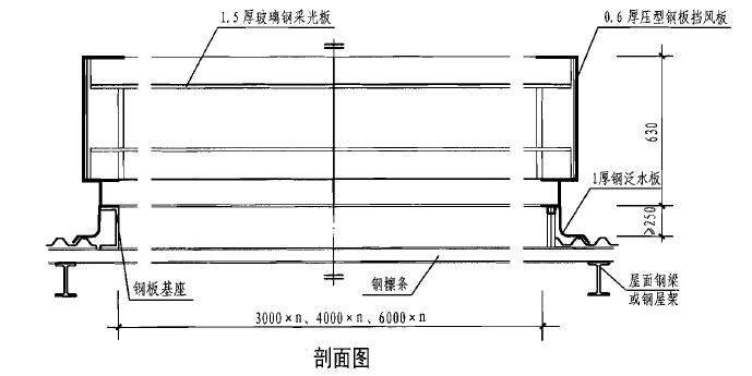 6.2我司生产制作的通风天窗。天窗架的焊接应校平直,其对角线误差每米±1.5mm,骨架平面扭翘不大于5.0mm。钢板基座采用有加筋板的C型钢形式或工字钢形式,由工程进行设计和制作安装。