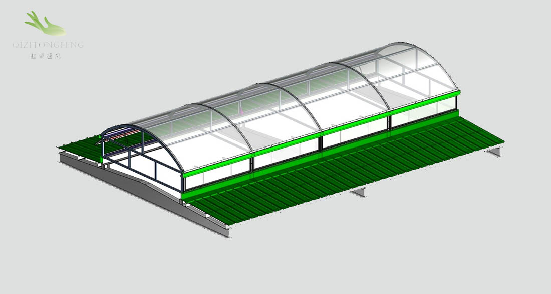 2.1.3上开式天窗整体骨架结构由矩形钢管和铝合金型材结合构成、天窗开启机构设置在天窗中间,一套天窗开启机构可开启长度1200m天窗。天窗开启扇向上开启,开启角度一般为30%~45。°